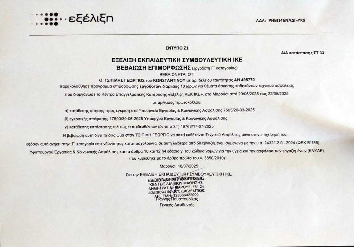 << Ο κ. Τσιπίλης Γεώργιος ολοκλήρωσε με επιτυχία το πρόγραμμα επιμόρφωσης Τεχνικών Ασφαλείας, αποκτώντας επίσημη βεβαίωση επιμόρφωσης από το Κέντρο Επαγγελματικής Κατάρτισης “ΕΞΕΛΙΞΗ”.